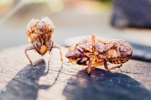 Dry skeleton of the nymph of the cicada insect, monstrous-looking, empty after its metamophosis.